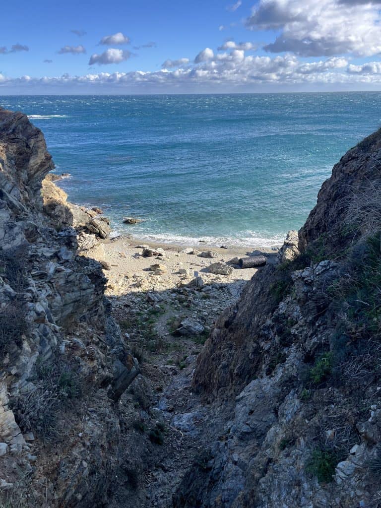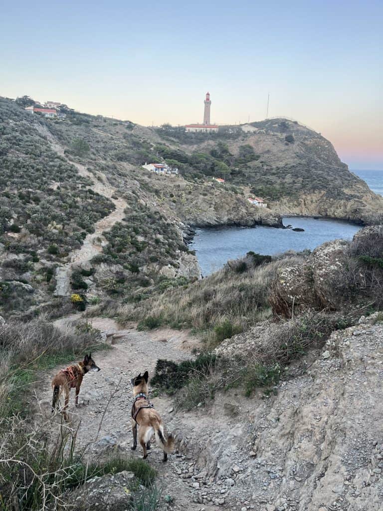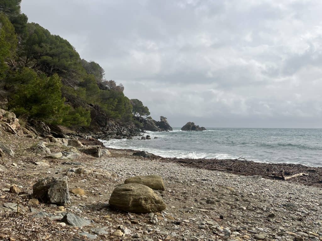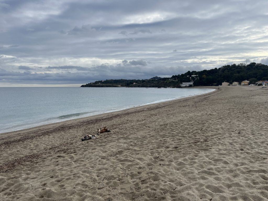 Die Etappe von Port Vendres nach Cebère ist um einiges herausfordernder, es geht ordentlich hoch und runter auf schönen schmalen Pfaden, vorbei am Leuchtturm am Cap Béar und kleinen Badebuchten zum großen Sandstrand Paulilles (keine Hunde erlaubt). Es ist sehr einsam um diese Jahreszeit.
