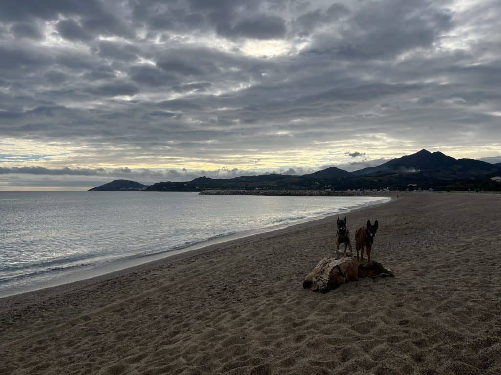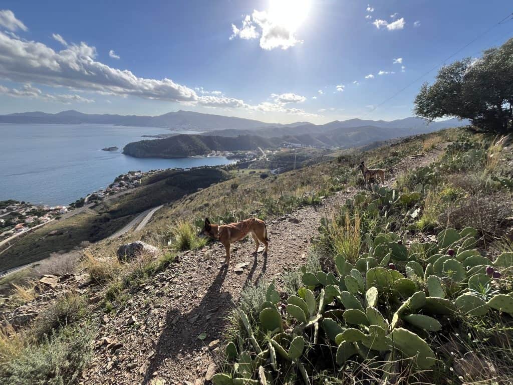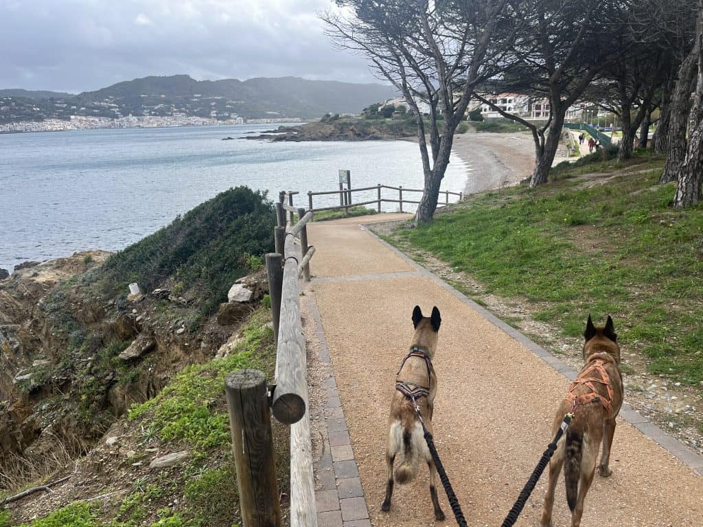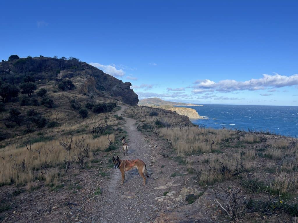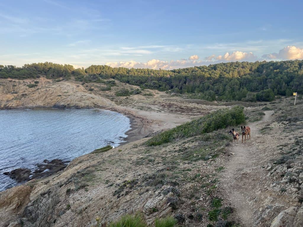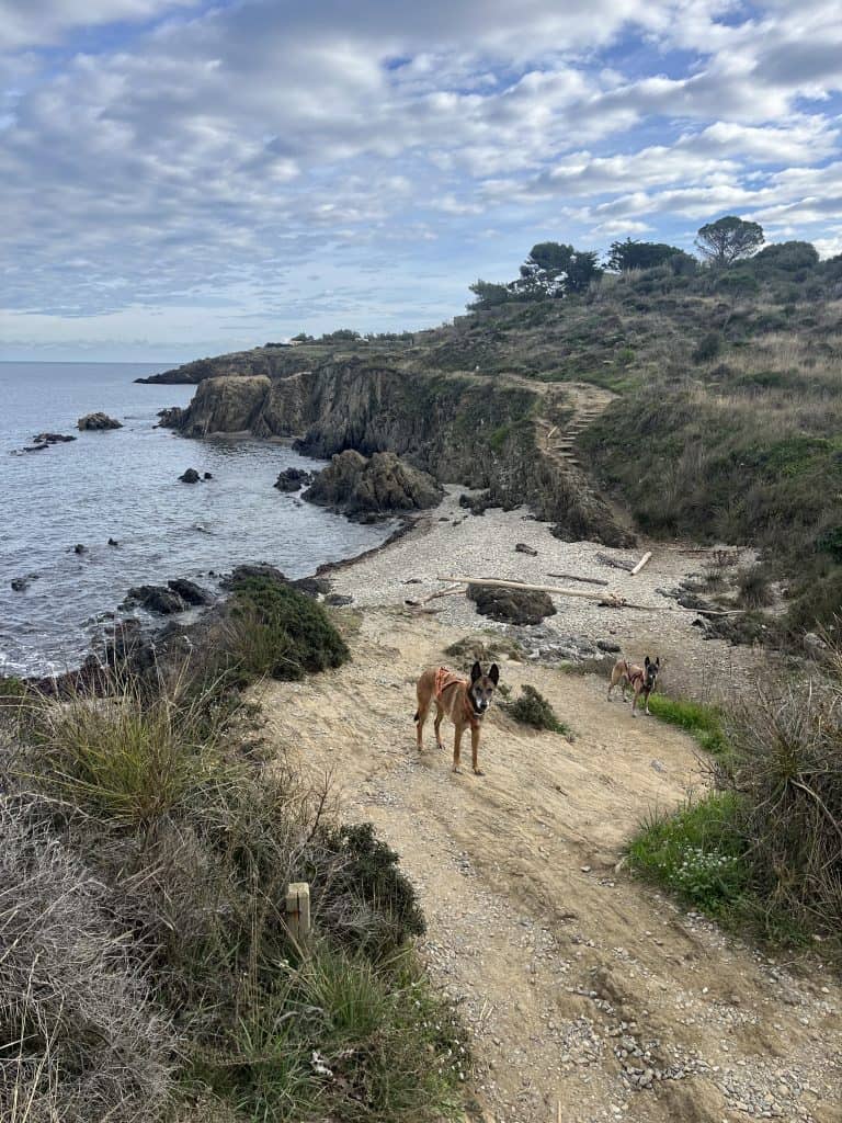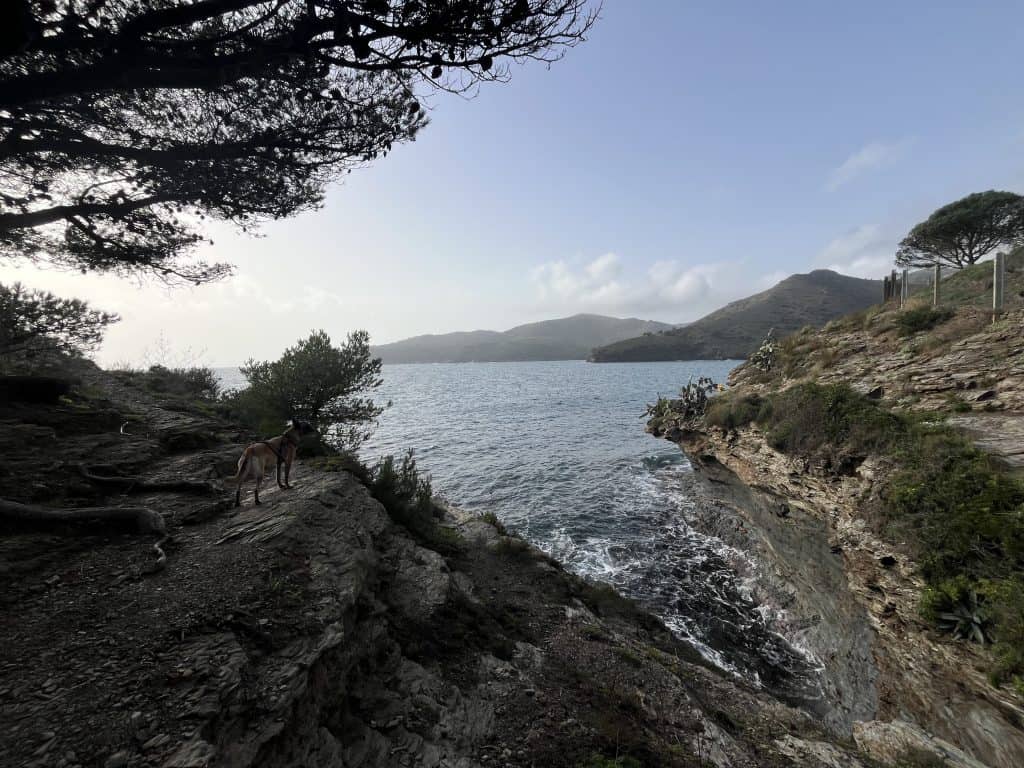 Mit den Hunden war es im Winter generell unproblematisch, der Weg war im November kaum frequentiert und somit war auch ein freilaufen lassen der Hunde weitgehend möglich. Im Sommer sind einige Strände für Hunde gesperrt und ein Umgehen auf der Straße wahrscheinlich nicht wirklich schön. Aufgrund der hauptsächlich exponierten Küste ist die Wanderung bei zu warmen Wetter im Sommer mit Hunden wohl auch generell nicht zu empfehlen. Es gibt so gut wie keine natürlichen Trinkmöglichkeiten für Hunde (Bademöglichkeiten aber genug), allerdings genug Ortschaften/Restaurants wo man den Wasservorrat nachfüllen kann. Hunde sind in Spanien in den Bussen nicht erlaubt, in der Bahn nur eingeschränkt, in Frankreich geht das einfacher. Dort fährt die Bahn auch einige Orte am Weg gut an. In Taxis waren die Hunde weder in Frankreich noch in Spanien ein Problem (bei Buchung anfragen!).