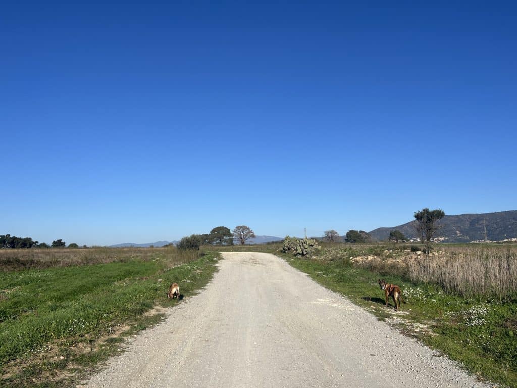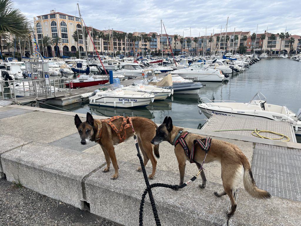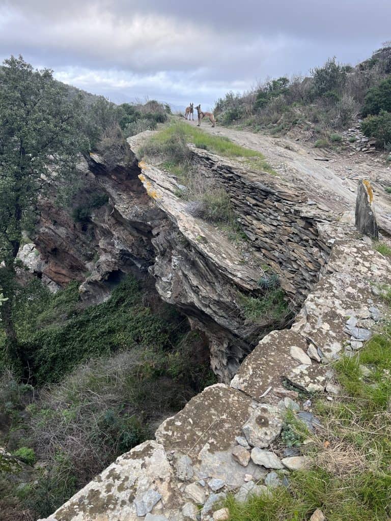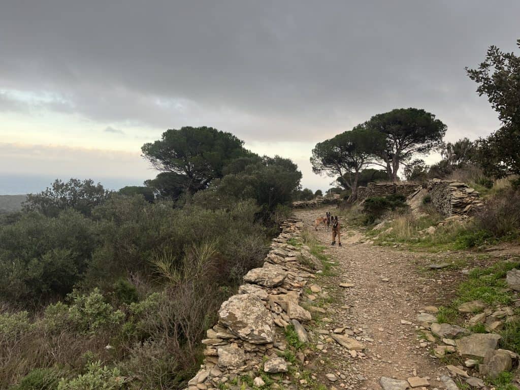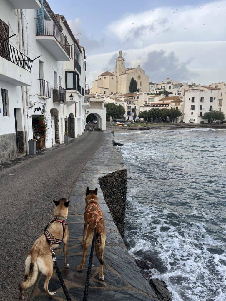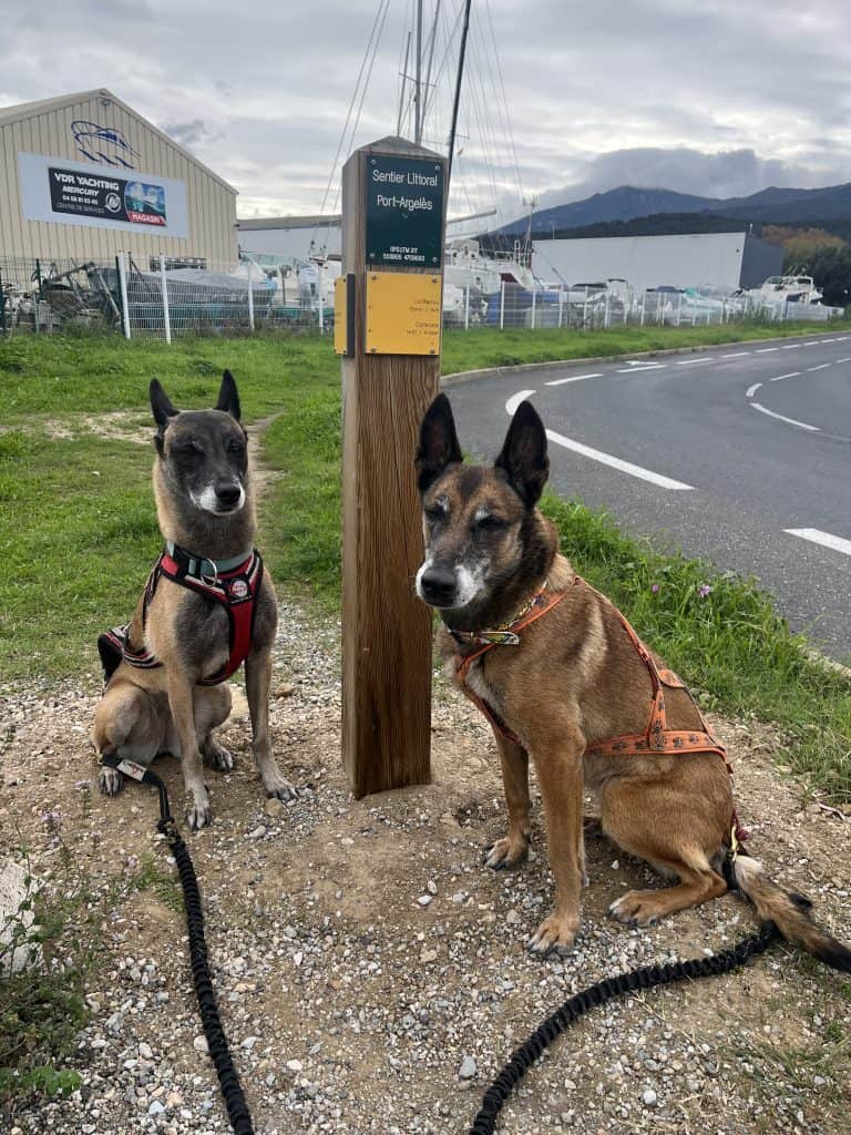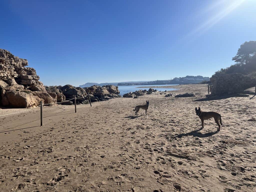 Mit den Hunden war es im Winter generell unproblematisch, der Weg war im November kaum frequentiert und somit war auch ein freilaufen lassen der Hunde weitgehend möglich. Im Sommer sind einige Strände für Hunde gesperrt und ein Umgehen auf der Straße wahrscheinlich nicht wirklich schön. Aufgrund der hauptsächlich exponierten Küste ist die Wanderung bei zu warmen Wetter im Sommer mit Hunden wohl auch generell nicht zu empfehlen. Es gibt so gut wie keine natürlichen Trinkmöglichkeiten für Hunde (Bademöglichkeiten aber genug), allerdings genug Ortschaften/Restaurants wo man den Wasservorrat nachfüllen kann. Hunde sind in Spanien in den Bussen nicht erlaubt, in der Bahn nur eingeschränkt, in Frankreich geht das einfacher. Dort fährt die Bahn auch einige Orte am Weg gut an. In Taxis waren die Hunde weder in Frankreich noch in Spanien ein Problem (bei Buchung anfragen!).
