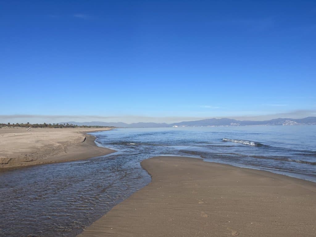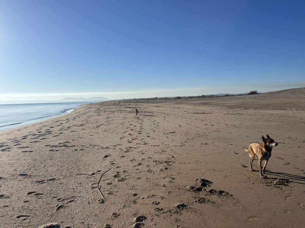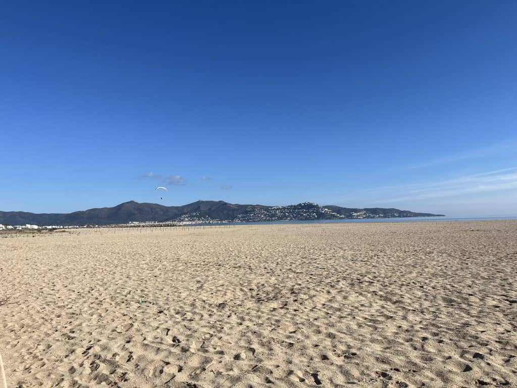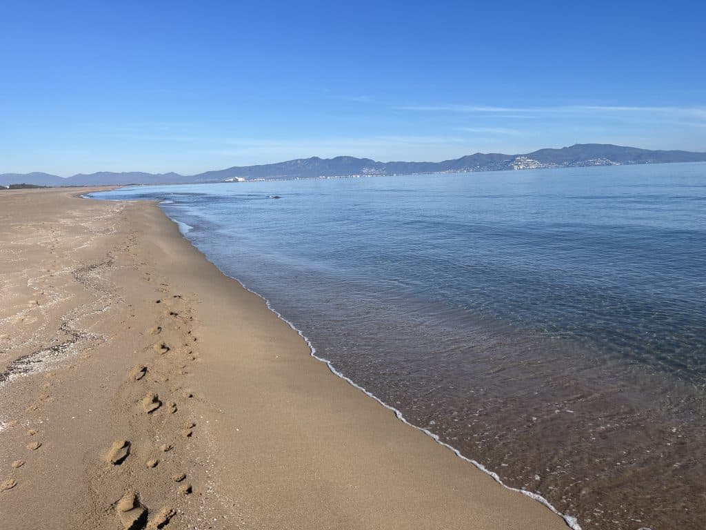 Am ewig langen und schönen Sandstrand entlang geht’s direkt nach L‘Escala. Leider ist der Strand zu bestimmten Jahreszeiten ein Vogelschutzgebiet und zusätzlich sind Hunde in einigen Bereichen ganzjährig nicht erlaubt. Noch dazu muss man am Strand durch ein paar Flussmündungen waten, deshalb sollte man vorher den Wasserstand prüfen (umgehen ist dann nur sehr weitläufig möglich).