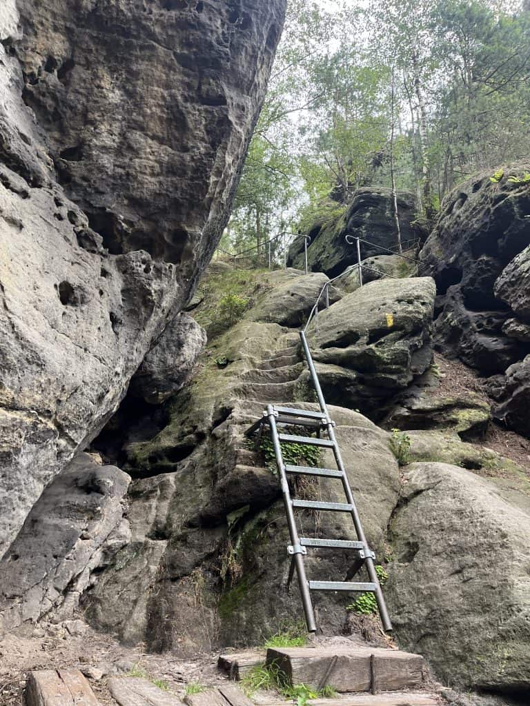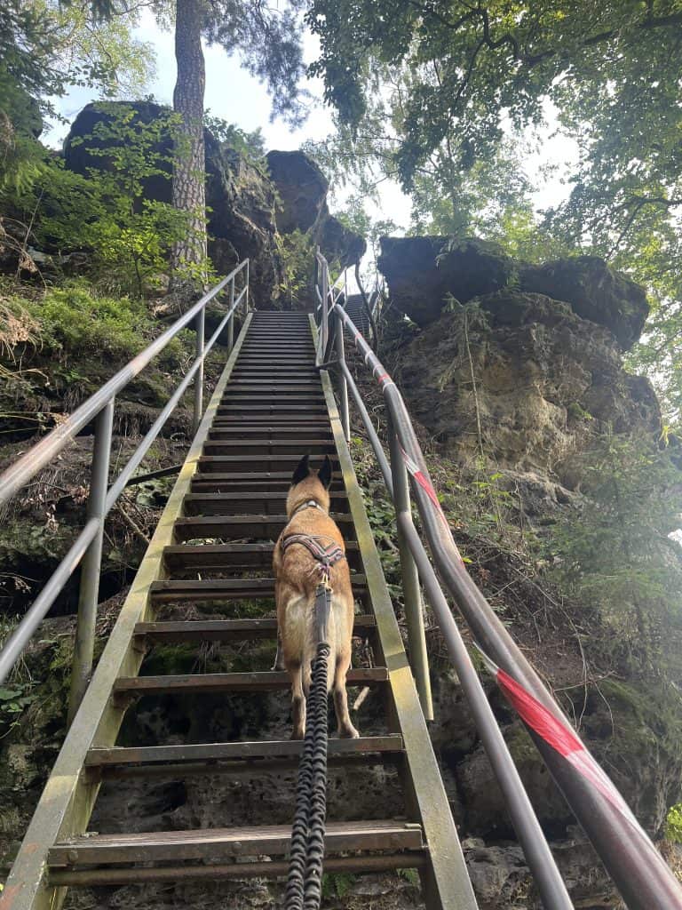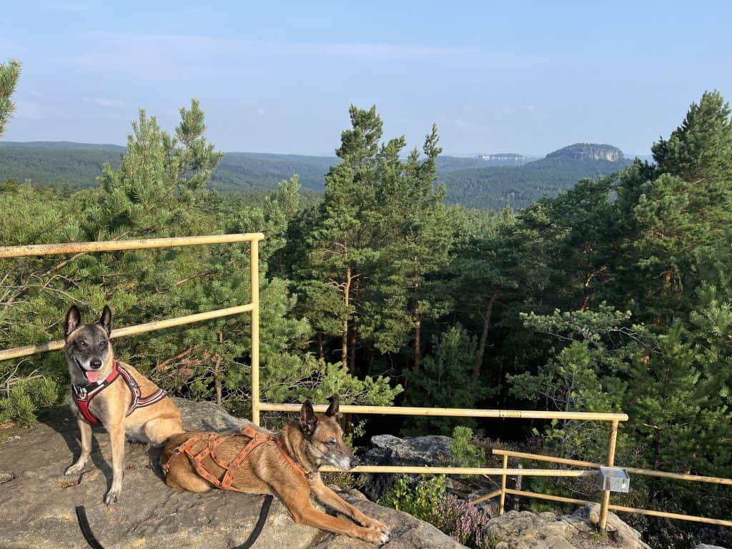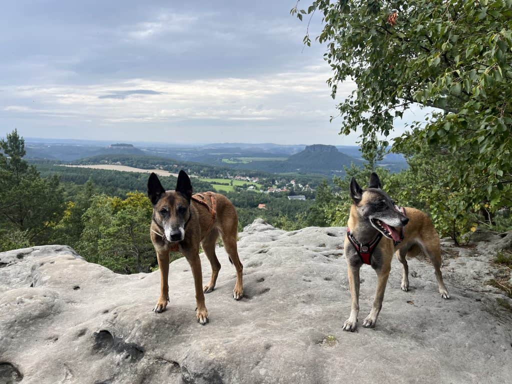 Am Papststein mit Ausflugslokal hat uns spätestens die Zivilisation wieder eingeholt, aber dafür gibt es super Aussicht, gutes Mittagessen und ausreichend Wasser für die Hunde. Ansonsten haben wir auf dem Weg keine Trinkmöglichkeiten gesehen. Über Leitern geht es wieder abwärts, nicht optimal für die Hunde, aber nichts was ein halbwegs trainierter und gesicherter Hund nicht hinbekommt. Hier ist allerdings schon recht viel los und es ist teils sehr eng. Hinter dem großen Parkplatz wird es aber sofort wieder einsam und über den Quirl und super Ausblicken auf den Pfaffenstein geht es zurück nach Königstein.