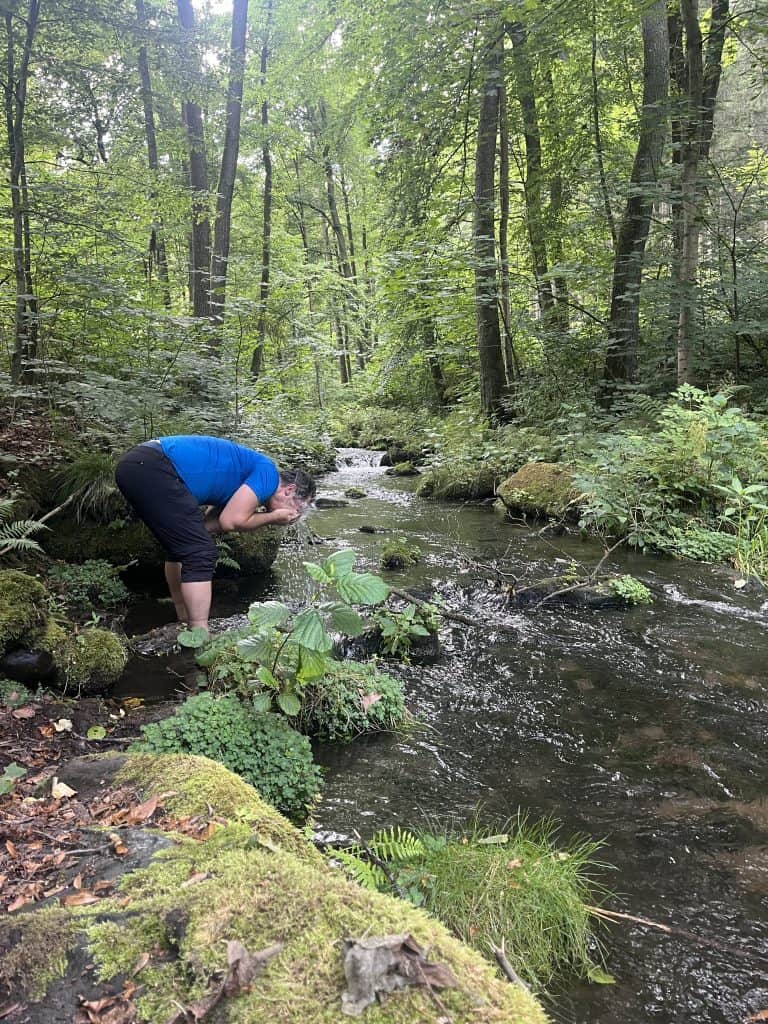 Mit dem tschechischen Taxi (Taxi Děčín) geht es in der Früh von Sněžník nach Königstein (Hunde kein Problem). Hinter Königsstein (mit einigen Einkaufsmöglichkeiten und Lokalen) geht es sofort wieder einsam durch den Wald, das ändert sich erst auf der anderen Seite der Biela wenn wieder einige schöne Felsformationen auf dem Weg liegen. Die Biela wird zweimal gequert und schafft Trinkmöglichkeit für die Hunde und Erfrischung für uns. In Nikolsdorf gibt es auch Trinkwasser aus einem Hahn.