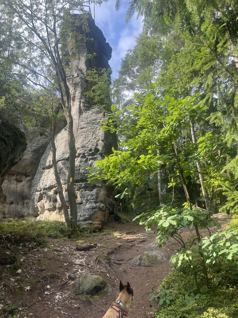Wir parken das Wohnmobil in Königstein (dedizierte Parkplätze direkt im Zentrum) und nehmen den Bus nach Bad Schandau Bahnhof (Hunde mit Maulkorb erlaubt). Ein kleines Stück läuft man nicht wirklich schön an der Elbe entlang (aber zumindest mit schönem Blick auf Bad Schandau) bis der offizielle Wegweiser zum Forststeig abgeht. Es geht viel einsam durch den Wald und an einigen hübschen Felsformationen vorbei.
