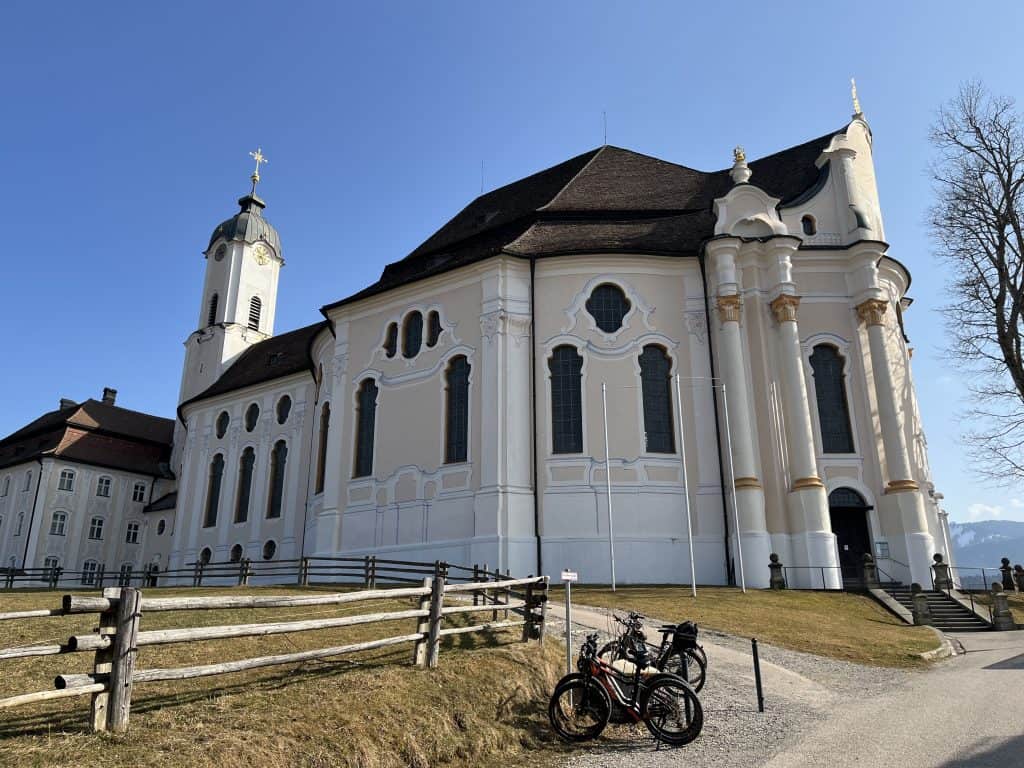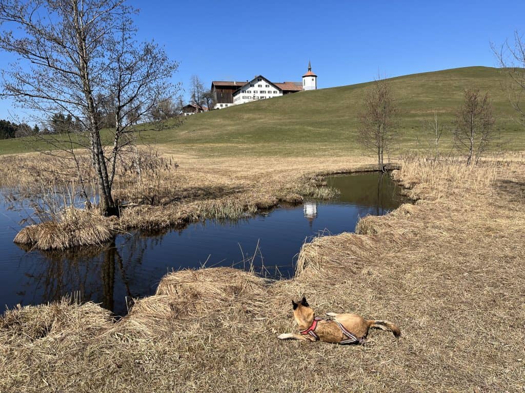 Die Wies-Kirche und die Umgebung mit vielen Mooren ist sehr schön und es gibt auch mehrere Lokale zur Versorgung, aber danach geht es auch wieder über viel Asphalt weiter und am Schluss über einige Kuhweiden – noch sind keine Kühe auf den Weiden, aber im Sommer könnte die Überquerung der Weiden mit Hunden ein Problem darstellen. Wasserstellen gibt es genug am Weg.