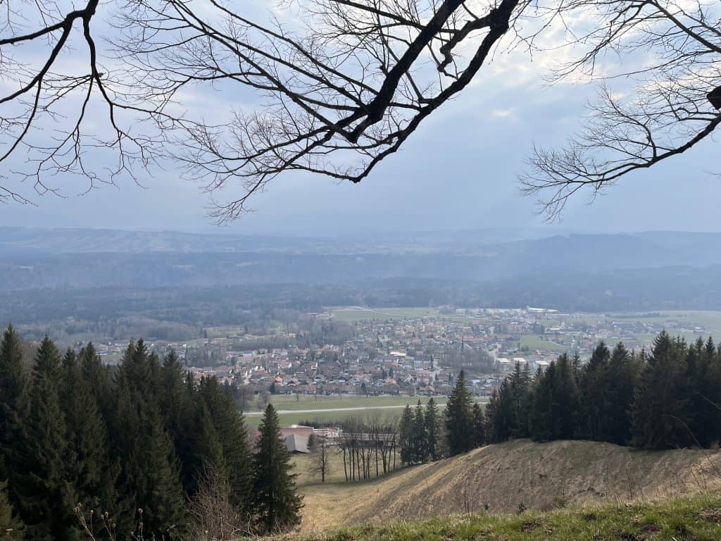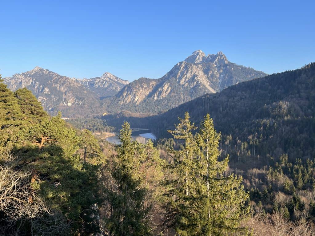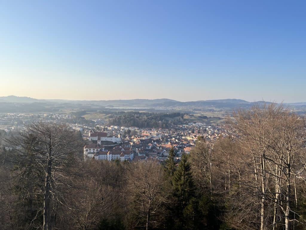 Auf den Kalvarienberg genießen wir die atemberaubende Aussicht von oben, auf der einen Seite Schwansee und Neuschwanstein und auf der Anderen Füssen mit Schloss.