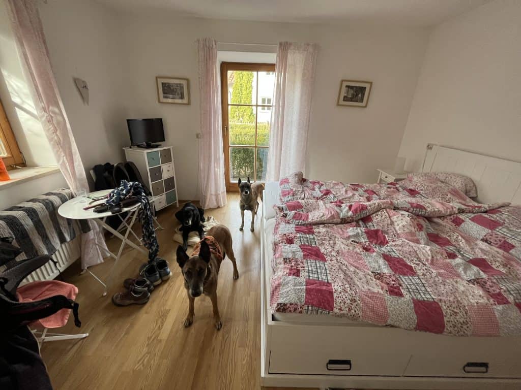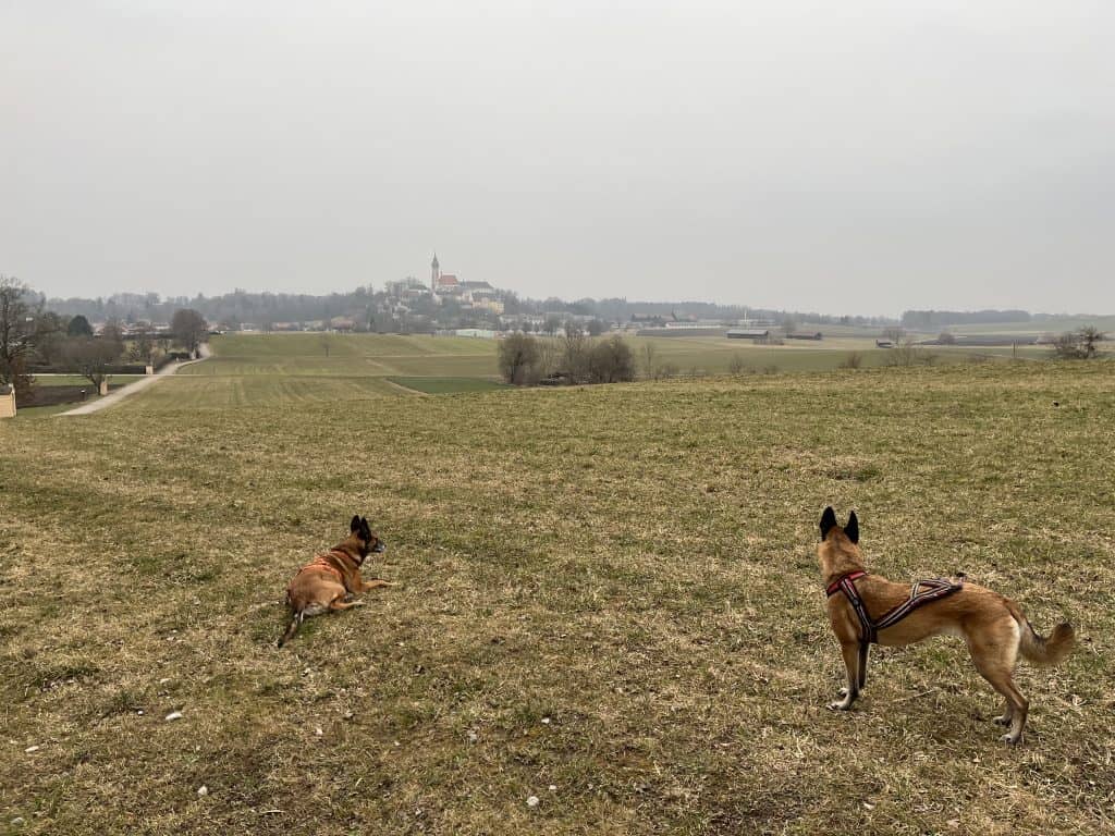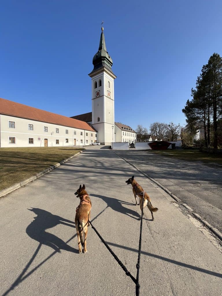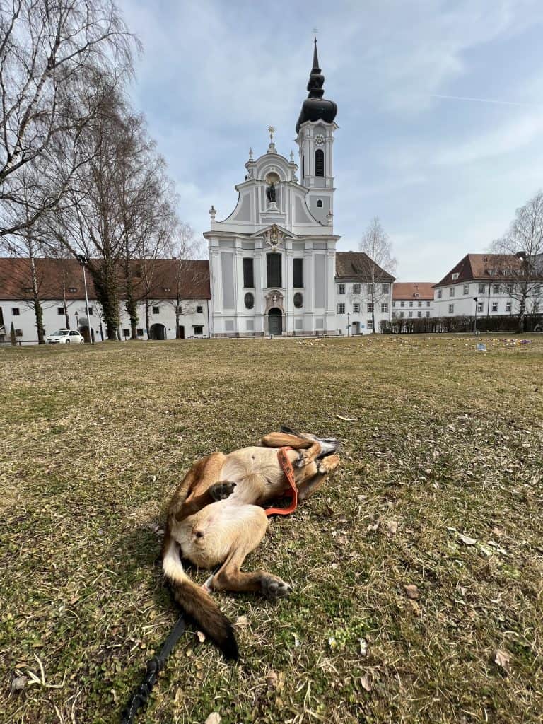 Kurz vor Rottenbuch dann leider der einzige unangenehme Vorfall der Tour. Aus einem Privatgrundstück ohne Zaun stürmen 2 fremde Hunde auf unsere teils angeleinten Hunde auf dem Wanderweg los, einer lässt sich durch energisches Anschreien verjagen, der zweite geht leider auf Chi los. Gottseidank erwischt er bei der Attacke nur Chi’s Haare, aber wir sind alle erstmal geschockt.