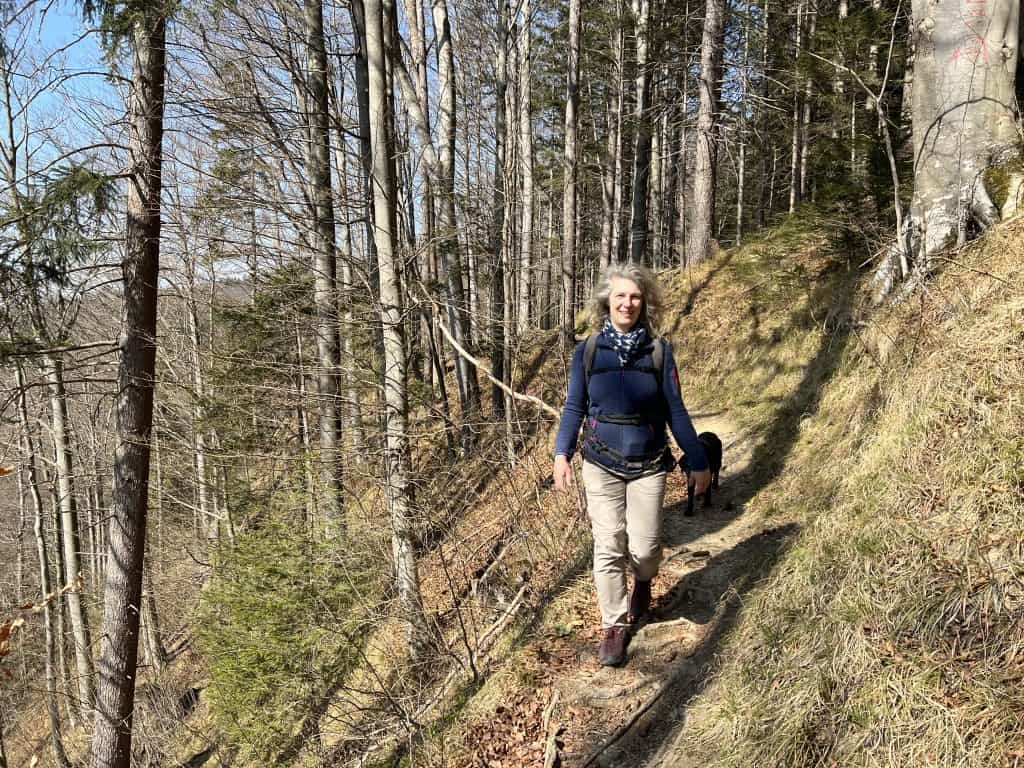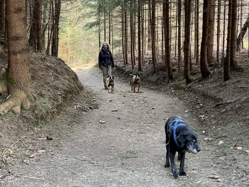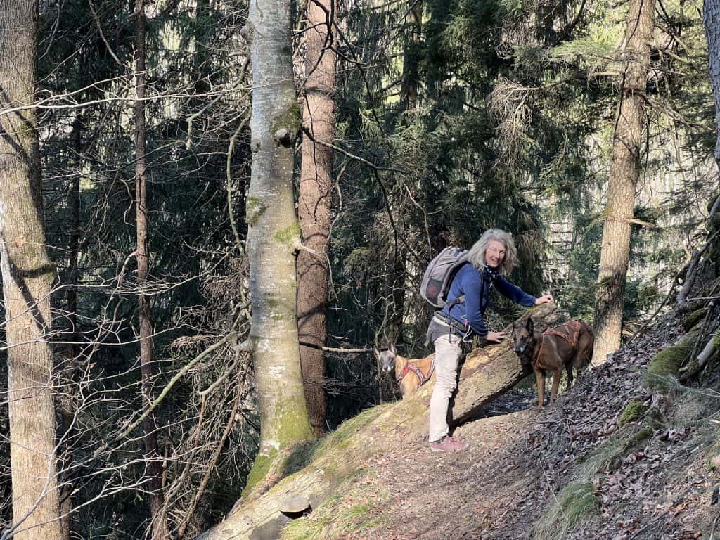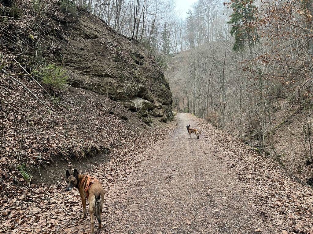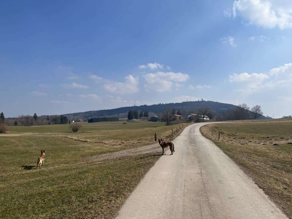 Akira braucht einige Pausen aufgrund des steilen Anstiegs aber die Strecke ist nicht lang und wir lassen uns viel Zeit damit. Auf der anderen Seite geht es wieder auf einem kleinen schönen Weg nach unten. Im Sommer sollte man besser Wasser für die Hunde dabeihaben, es gibt nicht wirklich etwas auf dem Weg. Auch ist es sinnvoll im Hotel Eibenwald wegen einer Brotzeit für mittags nachzufragen, es liegt nichts auf dem Weg wo man irgendwas einkaufen könnte. Für meinen Geschmack verläuft der Weg auf zu vielen Teerstraßen und durch zu viele Orte.