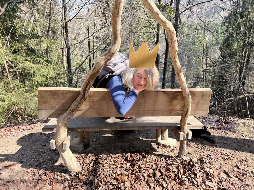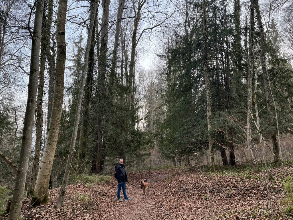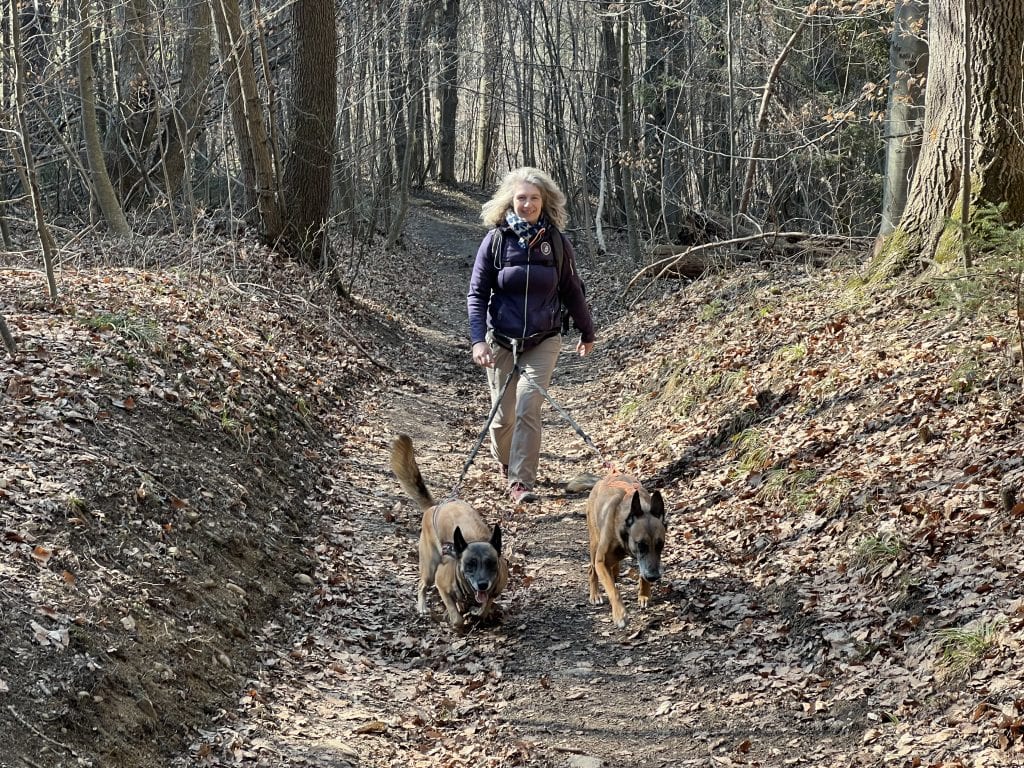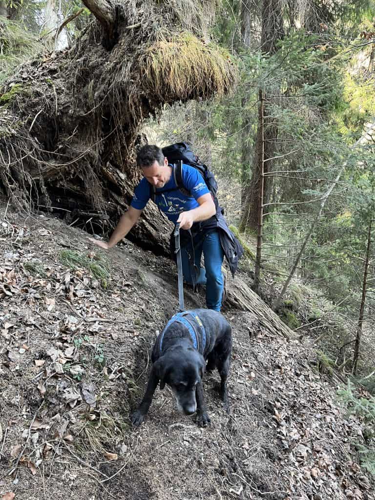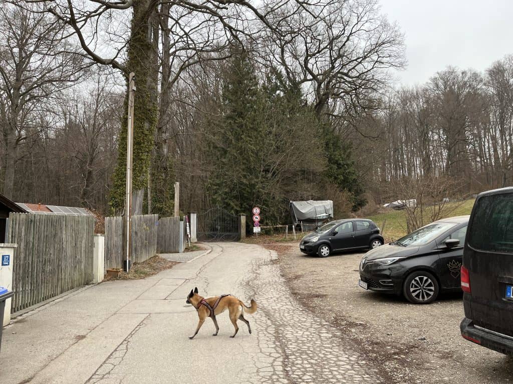 Akira braucht einige Pausen aufgrund des steilen Anstiegs aber die Strecke ist nicht lang und wir lassen uns viel Zeit damit. Auf der anderen Seite geht es wieder auf einem kleinen schönen Weg nach unten. Im Sommer sollte man besser Wasser für die Hunde dabeihaben, es gibt nicht wirklich etwas auf dem Weg. Auch ist es sinnvoll im Hotel Eibenwald wegen einer Brotzeit für mittags nachzufragen, es liegt nichts auf dem Weg wo man irgendwas einkaufen könnte. Für meinen Geschmack verläuft der Weg auf zu vielen Teerstraßen und durch zu viele Orte.