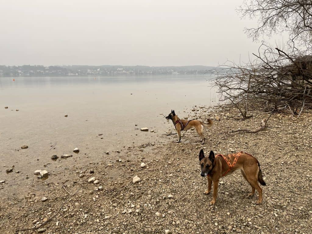 Es geht weiter Richtung Starnberg, der Fußweg führt teilweise direkt am See entlang mit schönen Ausblicken über den See (leider ist es dank Saharastaub relativ diesig), aber teilweise auch versetzt mit abgezäunten Grundstücken und Villen dazwischen. Es gibt aber immer wieder Möglichkeiten die Hunde ins Wasser zu lassen, zumindest außerhalb der Saison vom 15.5-15.9 (zahlreiche Hundeverbotsschilder weisen darauf hin).