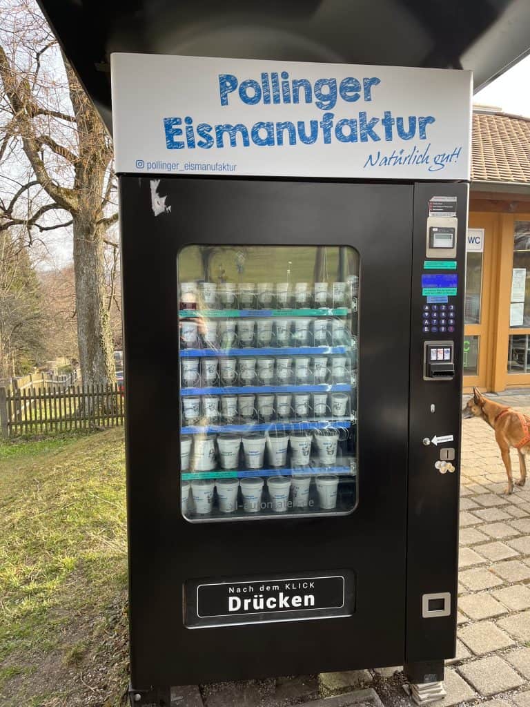 In Wessobrunn fällt der erste Blick auf einen Eisautomaten direkt am Hauptplatz, genau das Richtige für eine kurze Pause – sehr leckeres Eis in vielen Sorten.