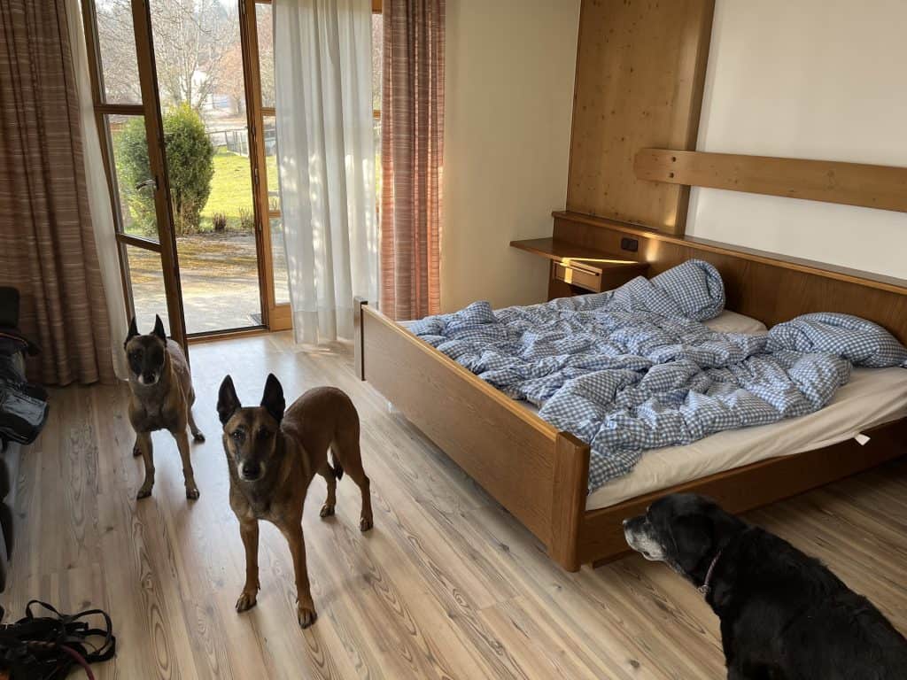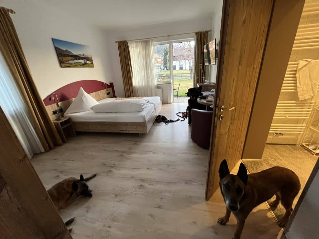 Wir übernachten im Hotel/Restaurant Eibenwald landgasthof-eibenwald.de mit sehr leckerem Abendessen und Frühstück. Das Zimmer ist einfach aber mit schönem Boden und großer Terrasse- perfekt mit Hunden.