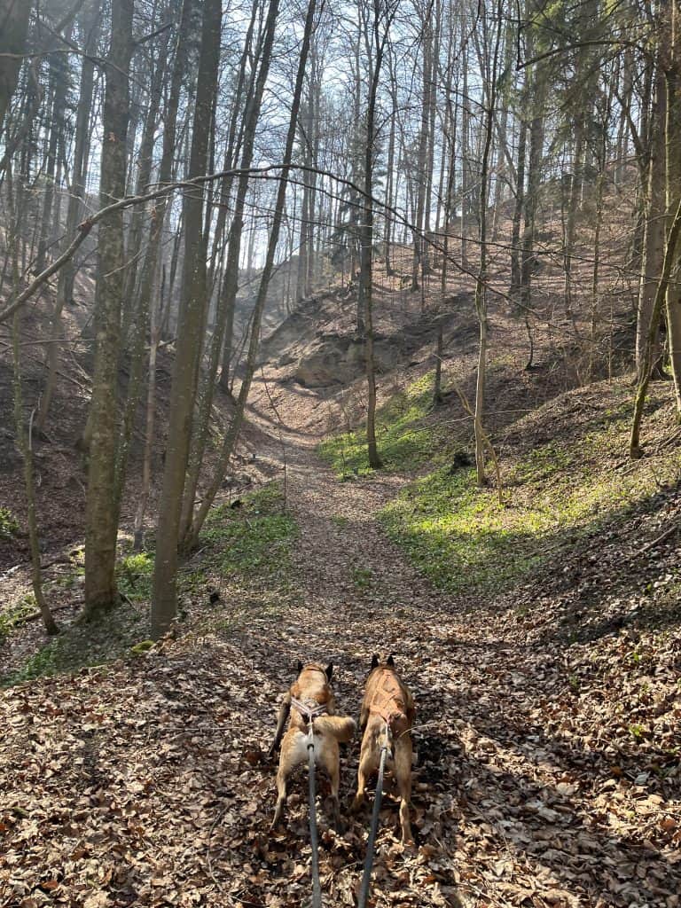 Nach dem super Frühstück im Martina’s Place verlassen uns Robert und Akira wieder, denn die beiden nächsten Etappen sind zu lang für Akira. Ich mache mich also mit den beiden Malis alleine auf den Weg und das Tempo wird deutlich schneller. Beide tragen ein Zuggeschirr und ich bin mit einer flexiblen Leine um den Bauch mit ihnen verbunden. Durch diese Zugunterstützung sind wir um Einiges flotter als normal unterwegs.