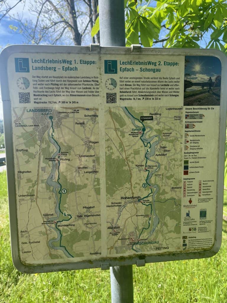 Von Peiting nach Schongau führt der Weg zuerst sehr schön über den Kavalerienberg, dann leider über sehr viel Asphalt. In Schongau lohnt ein kurzer Stopp in der hübschen Altstadt. Danach führt der Weg meist sehr schön über den schmalen Höhenweg oberhalb des Lechs entlang mit guten Ausblicken. In Kinsau gibt es einen Brunnen mit Trinkwasser. Erst gegen Ende geht es dann recht nah am Lech entlang. In Epfach gibt es paar wenige Parkplätze an der Bushaltestelle. Der Bus fährt bis Schongau, von Schongau nach Peiting fährt ein Zug.