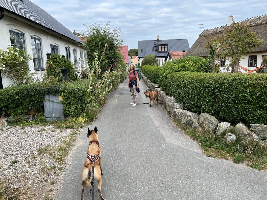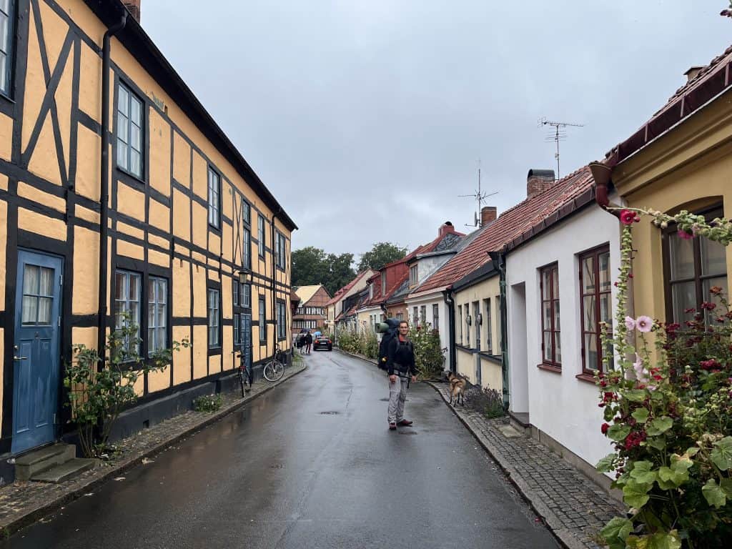 Es geht weiter auf Dünenwegen am Meer entlang. Vor Simrishamn das erste Hundeverbotsschild am schönen langen Sandstrand (in der Saison), der Weg würde an der Straße weiterlaufen aber wir gehen durch einen Park bis ins nette Stadtzentrum. Hier gibt es auch einige Restaurants.