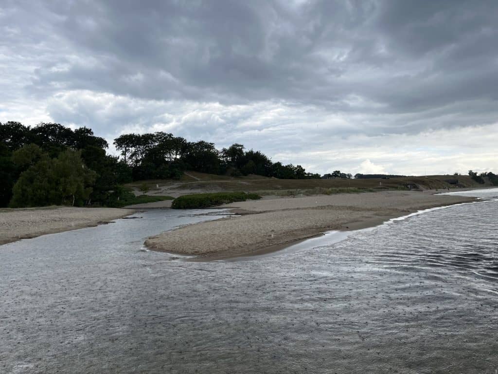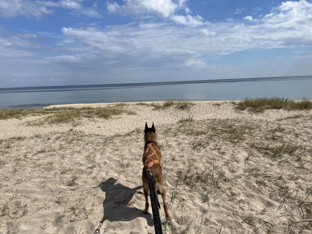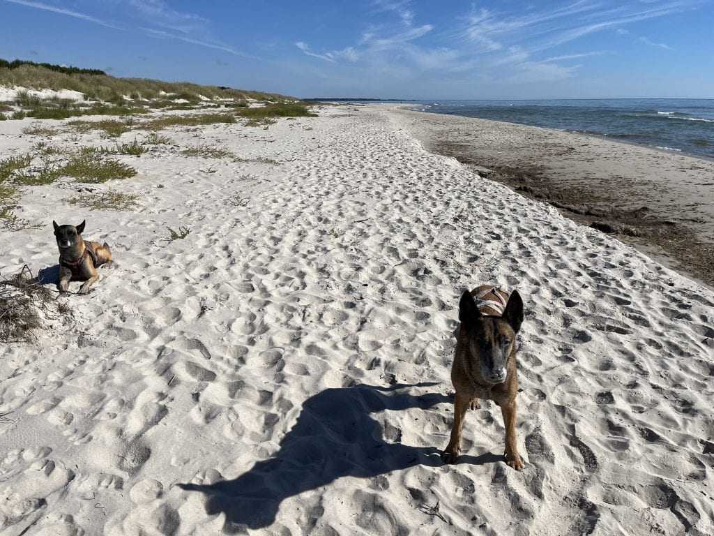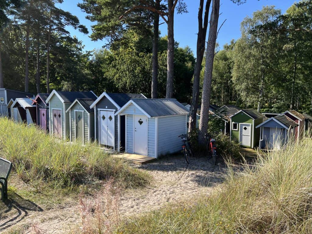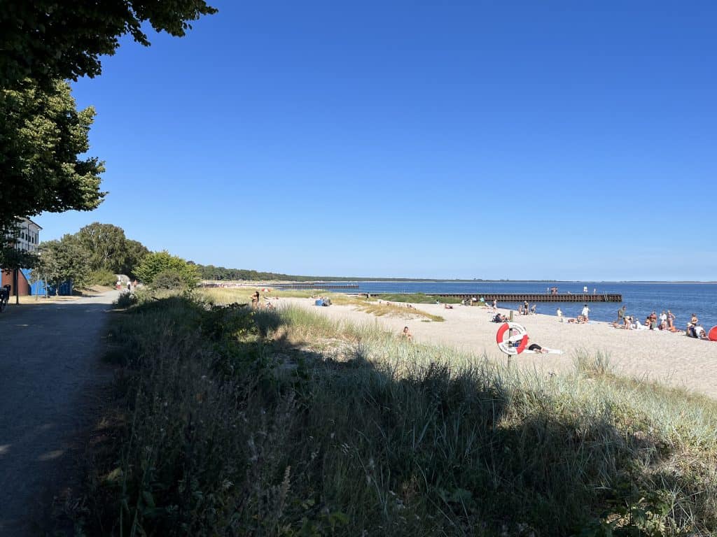 Je näher wir dem nächsten Ort Nybrostrand kommen umso mehr füllt sich der Strand wieder mit Menschen, Richtung Ystad wird es dann immer voller und voller. Wir weichen auf den Waldweg parallel zum Meer aus, am Strand sind keine Hunde erlaubt (1.6-30.9). In Ystad mündet der Weg in die schöne aber exponierte Strandpromenade, es ist sehr viel los und es gibt ein paar nette Cafés und viele Badehäuschen. Richtung Hafen wird es wieder ruhiger, die Fähre zurück nach Rügen wartet schon auf uns.