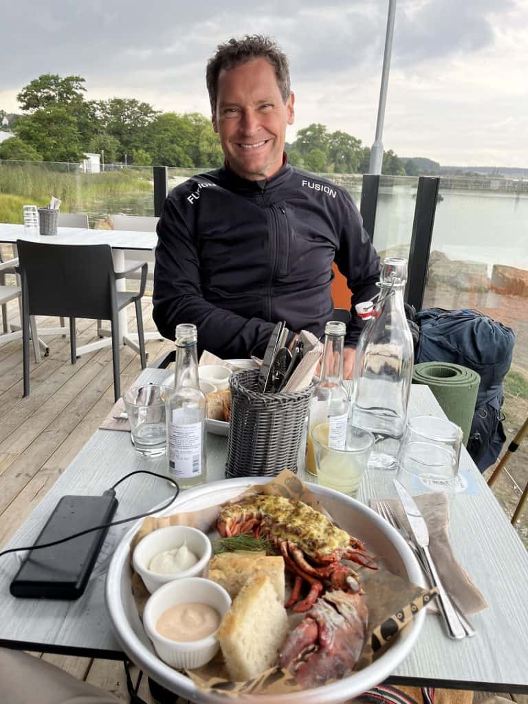 Wir essen im Hafenrestaurant Hummer, dann geht es leider ein Stück an der Asphaltstraße entlang bis zur Mosterei Kivik. Die Mosterei kann man besichtigen und auch einkaufen, allerdings sind die Flaschen zu schwer für uns zum Mitnehmen. Hunde sind im Innenbereich keine erlaubt.