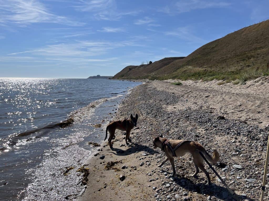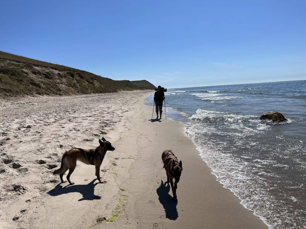 Es geht sehr lange am Strand weiter, zuerst ist noch recht viel los aber es werden immer weniger Menschen. Erst bei Sandhammeren ganz im Süden gibt es große Parkplätze, einen Leuchtturm und einen Kiosk. Hundeverbotsschilder gibt es an den Strandzugängen wohl auch welche, aber die sieht man nicht wenn man am Strand entlang wandert.