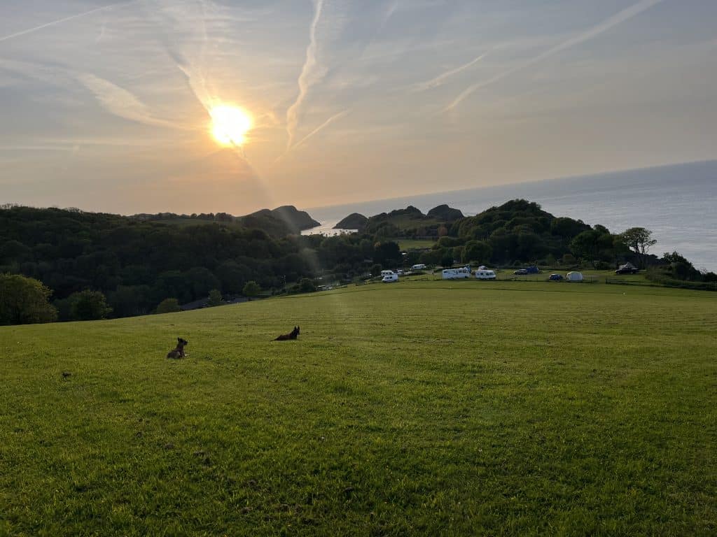 Wir stehen am Land’s End Camping auf einer großen Wiese mit Blick aufs Meer und tollem Sonnenuntergang.